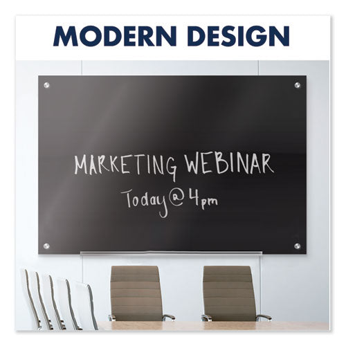 Ultra-modern, tempered-glass-surface whiteboard delivers high-quality performance. Durable, tempered-glass provides a smooth writing platform. This frameless board is a good fit for any contemporary office and will help you stay organized. Hardware is included for simple and secure wall mounting. Occasional cleaning is recommended for best performance. Black Glass Magnetic Board Surface—Works best with Quartet® Neon Dry Erase Markers (sold separately). Board Type: Magnetic Dry Erase; Board Width: 72"; Board Height: 48"; Surface Material: Glass.