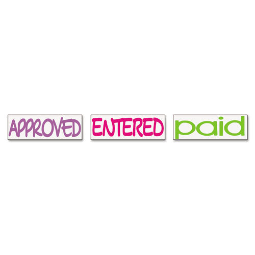 Innovative design allows you to interlock multiple stamps in one continuous stack. Convenient for storage and effortless use. Vibrant, fluorescent ink colors and fresh fonts provide style. Crisp, clean impressions from the microporous gel. Ink lasts for up to 50,000 impressions. Stamp Type: Message; Message(s): APPROVED; ENTERED; PAID; Ink Types: Pre-Inked; Impression Width: 1.81".