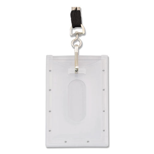 Protects your ID card or badge while keeping it visible. An ID card (sold separately) slides in and stays in place, but is also easy to remove when you need it with a thumb cutout and cutout edge on the back. This rigid plastic card holder can be attached to lanyards, clips or card reels. Accommodates cards up to .30mm thick. Orientation: Horizontal; Name Badge Holder Length: 3 11/16"; Name Badge Holder Width: 2 5/16"; Name Badge Holder Color(s): Clear.