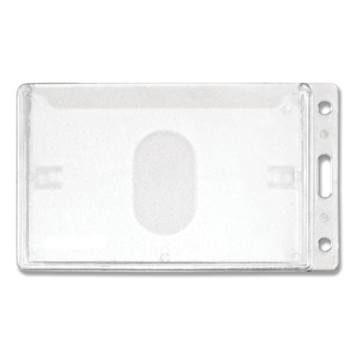 Clear, rigid, molded plastic delivers durability and style. Holds two standard thickness ID or credit cards and features a thumb notch for easy card removal. Slot and pin holes accommodate lanyards, straps and chains. Holds Two Cards. Orientation: Vertical; Name Badge Holder Length: 4.13"; Name Badge Holder Width: 2.5"; Name Badge Holder Color(s): Clear.