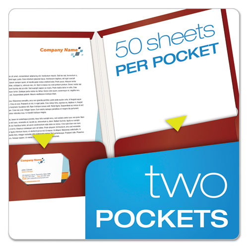 Bright, laminated high-gloss covers get attention. Die-cut business card holder on inside front cover keeps contact information at hand. For 11 x 8.5 sheets. Holds up to 100 sheets (50 per pocket). Front Cover Color(s): Crimson; Color Family: Red; Back Cover Color(s): Crimson; Sheet Size: 11 x 8.5.