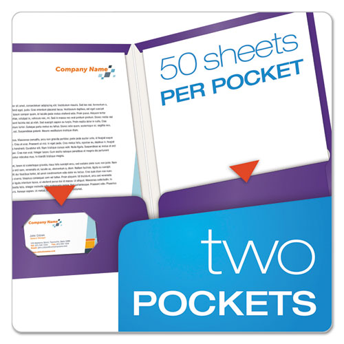 Bright, laminated high-gloss covers get attention. Die-cut business card holder on inside front cover keeps contact information at hand. For 11 x 8.5 sheets. Holds up to 100 sheets (50 per pocket). Front Cover Color(s): Purple; Color Family: Purple; Back Cover Color(s): Purple; Sheet Size: 11 x 8.5.