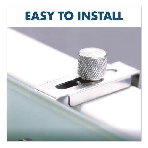 Have your very own message board, with a handy, personal-sized board that fits perfectly in cubicles, even if they have low walls. Tempered white glass surface dry-erase board is durable and will not stain or ghost; provides clean erasability. Sturdy enough to resist scratches and dents. Magnetic quality allows writing and posting of messages with dry-erase markers and rare earth magnets. Frameless board design is sleek and attractive. Two mounting hardware sets are included: adjustable brackets to hang board over cubicle walls and wall mount for traditional hanging. Writing in all colors is easily visible on the white glass board surface. Board Type: Magnetic Dry Erase; Board Width: 30"; Board Height: 18"; Surface Material: Glass.